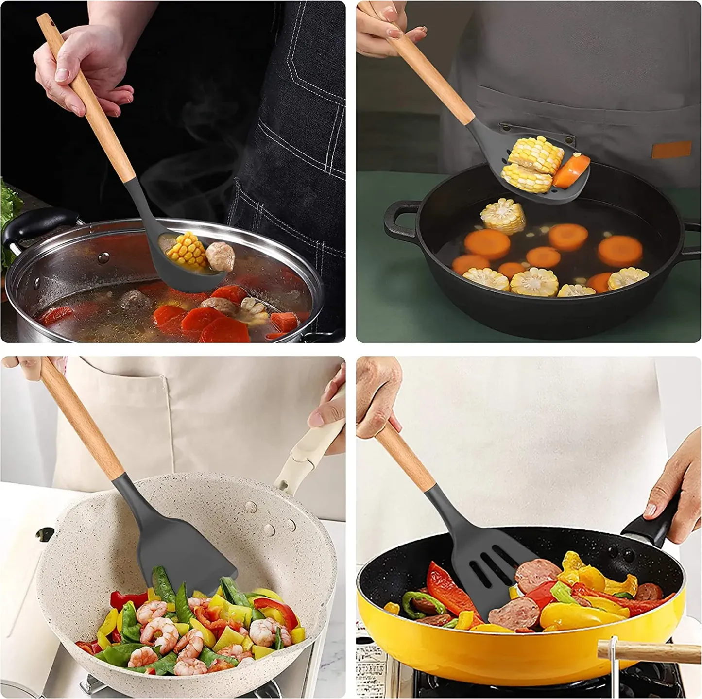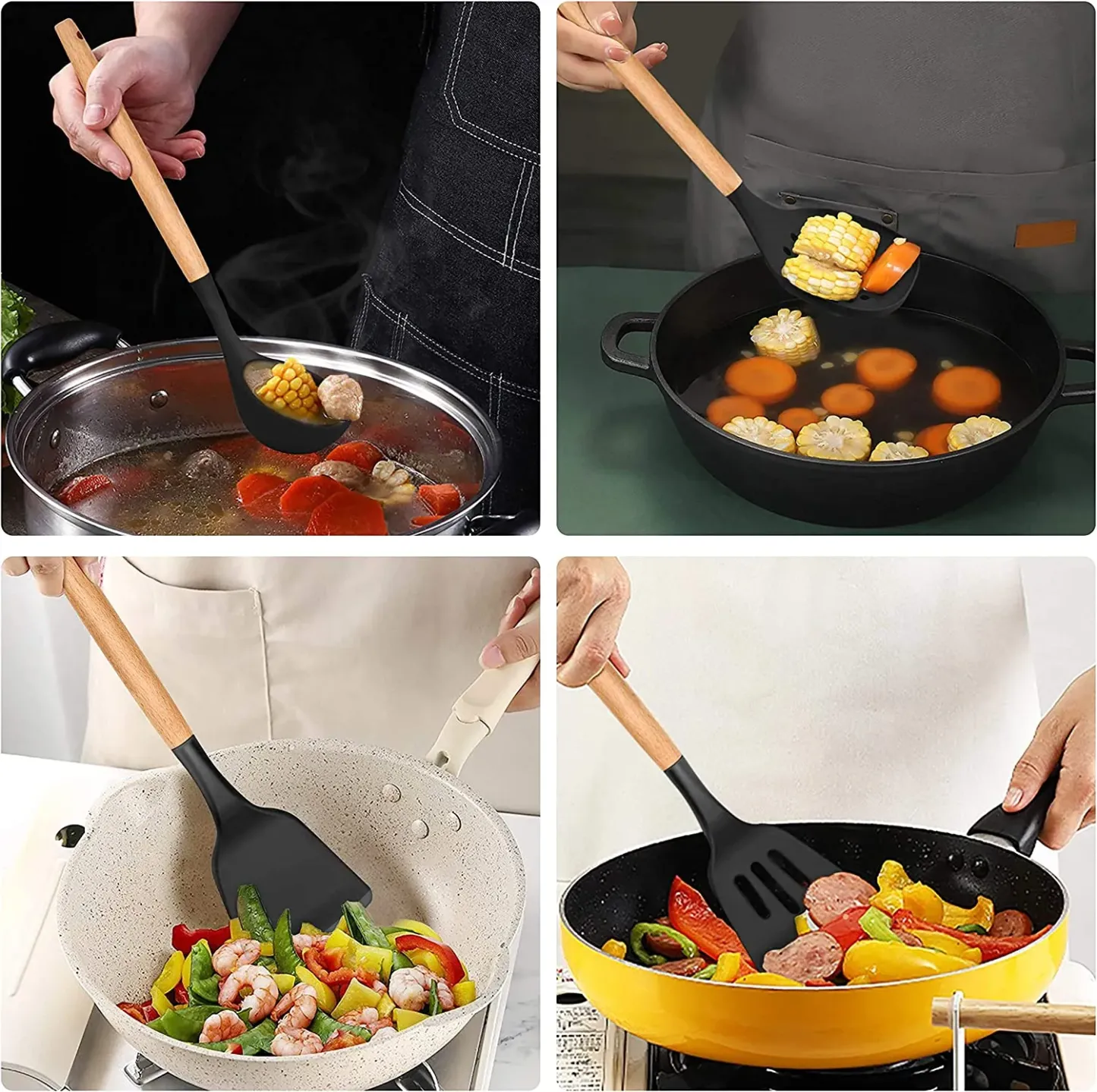 Heat Resistant, Silicone cookware utensils set can withstand high temperature up to 446ºF, they would not melt at high temperature cooking like frying or touching hot pans, Ergonomic wooden handle can effectively block the heat transfer to prevent the chef’s hands from scalding during cooking