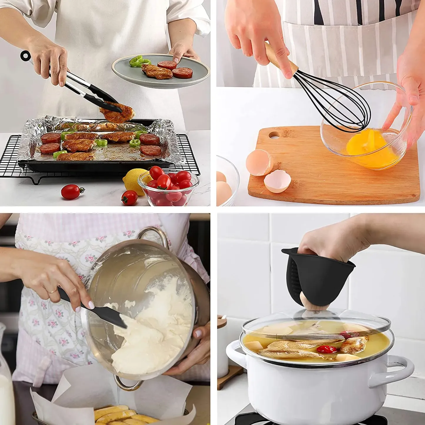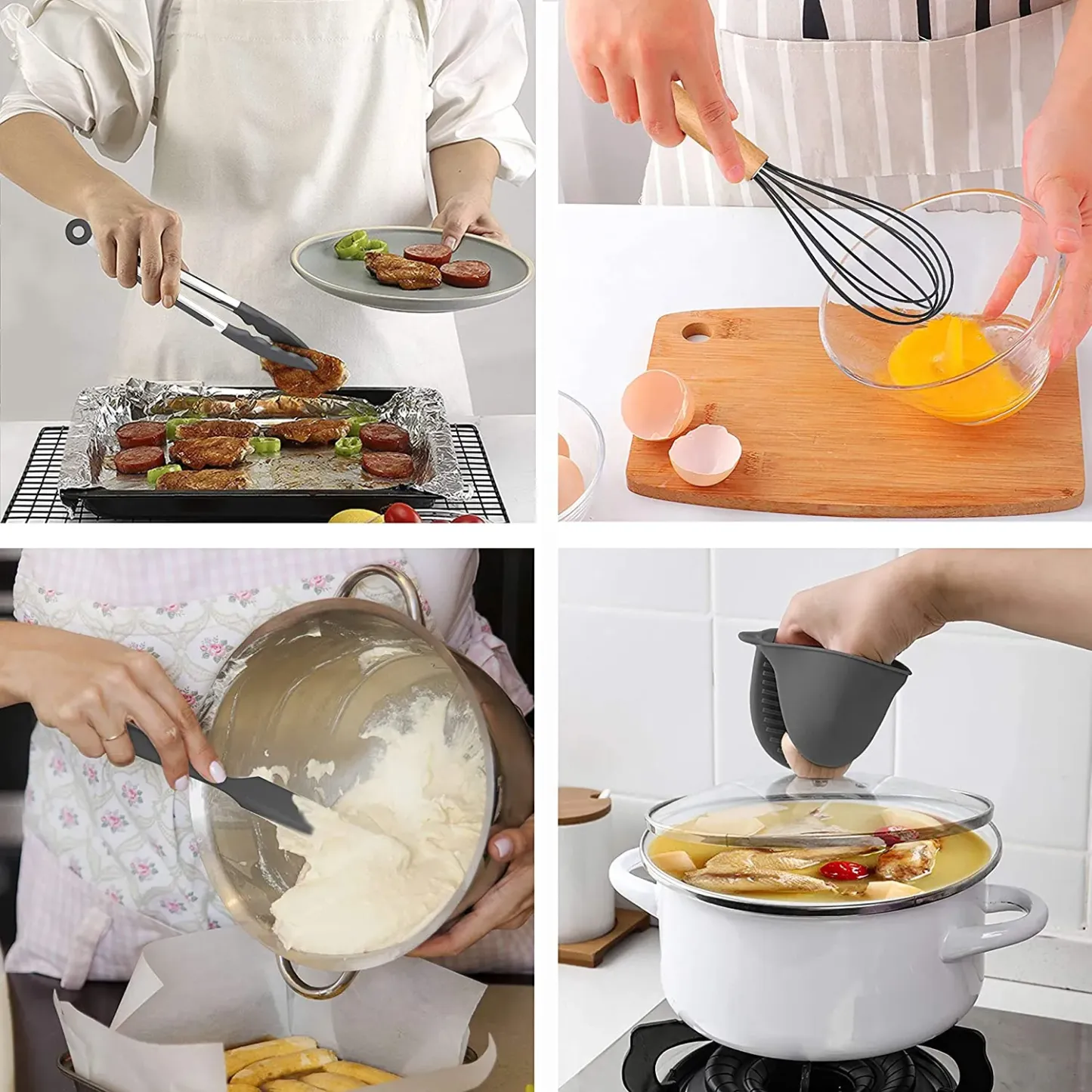 Complete Cooking Utensils, This professional set is the most complete set containing different cooking utensils to satisfy your various cooking needs, includes turner, slotted turner, spoon, slotted spoon, skimmer, soup Ladle, spoonula, pasta server, tongs, spatula scraper, spatula, spreader spatula, whisk, basting brush, metal cooking spatula, metal long spatula, dough chopper, oven mitts, 10 x hooks and utensil holder