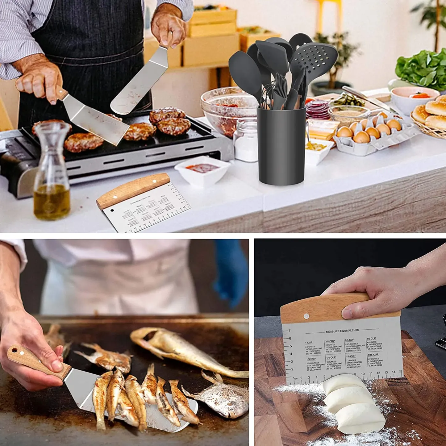 Attach Metal Spatula, Plus metal cooking spatula turner, long spatula and dough scraper, Smooth matt finish surface reduce food sticking, Angle with sharp and beveled edge help flipping and cutting foods efficiently, Sturdy triple rivets handle will not loose or come apart, Great for your daily cooking, baking pancakes, frying steak, grilled fish, cutting cookie dough, chopping salad and vegetables and more