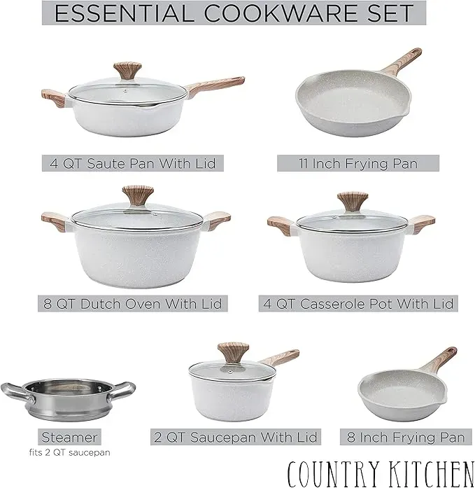 SET INCLUDES - A complete kitchen essentials set, you're getting a total of 11 pieces. Including an 8 qt casserole pot with glass lid, a 4 qt casserole pot with glass lid, a steamer, an 11” frying pan, an 8” frying pan, a 11' deep frying pan with glass lid, and a 2 qt sauce pan with glass lid. These beautiful cookware sets are designed with a speckled coating and woodlike handle. Not only functional, but these sauté pans are decorative as well.