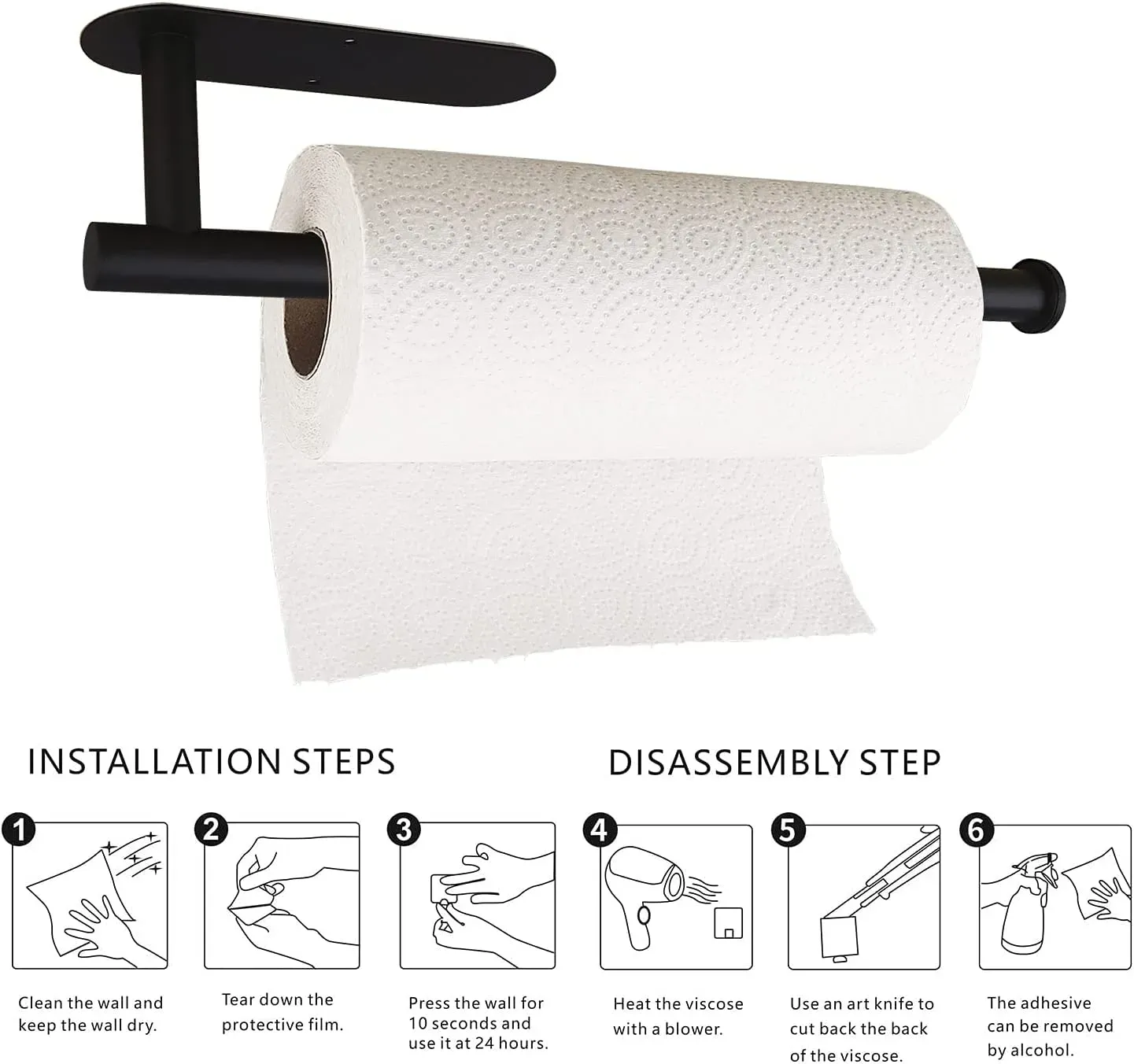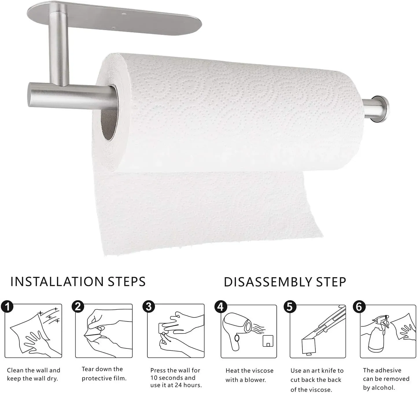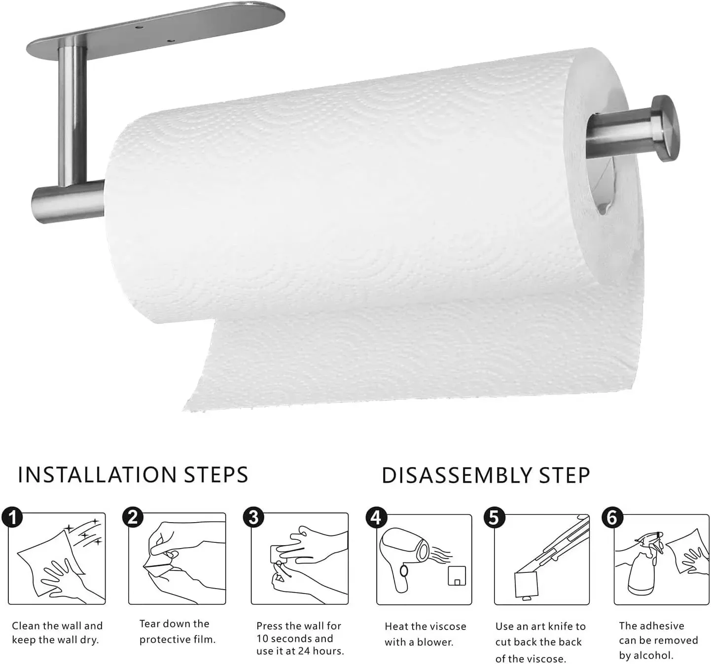 [Characteristic]: Paper towel holder under cabinet mount:Paper towel holder constructed of SUS 304 Stainless Steel,Strong and not easily deformed,Waterproof and Rustproof.It has good load-bearing and stickiness, and it is not easy to fall off