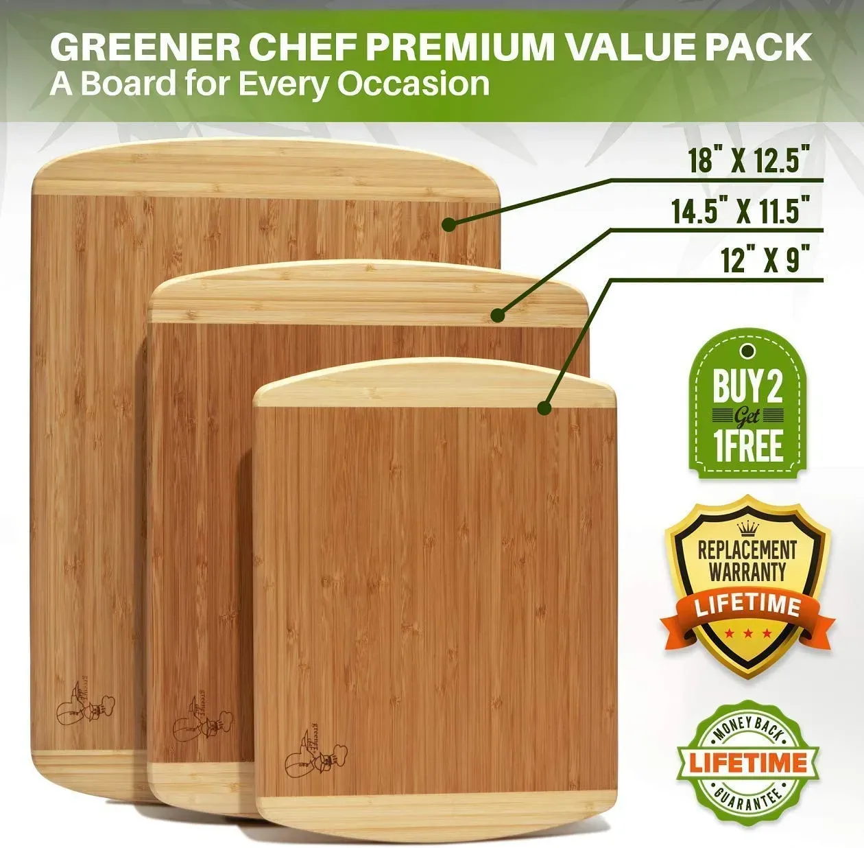 LIFETIME WARRANTY - MONEY BACK GUARANTEE – The last bamboo cutting board set you’ll ever need, guaranteed, in 3 “Just the Right Sizes”; 1 Extra Large Bamboo Cutting Board (18 x 12.5', 3.5lbs) 1 Medium Sustainable Bamboo Wood Cutting Board (14.5 x 11.5', 2lbs) and 1 Small Wooden Cutting Board (12 x 9', 1.5lbs) to satisfy every creation & craving.