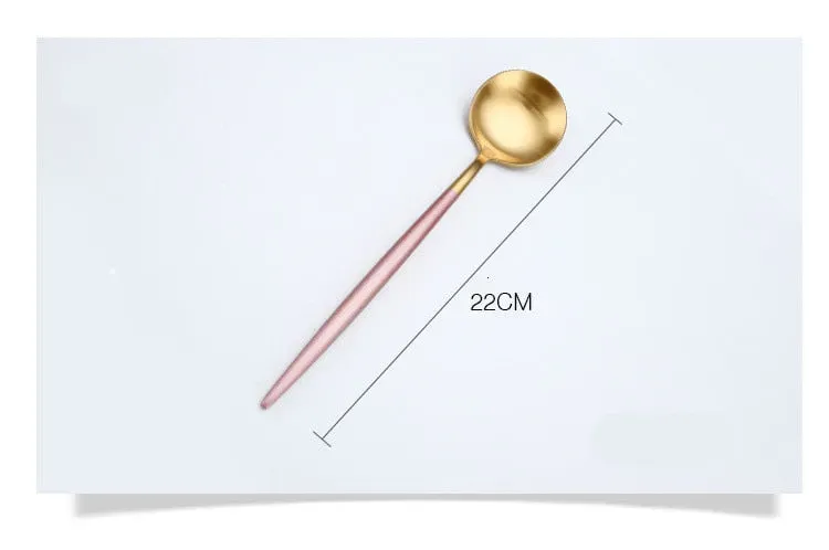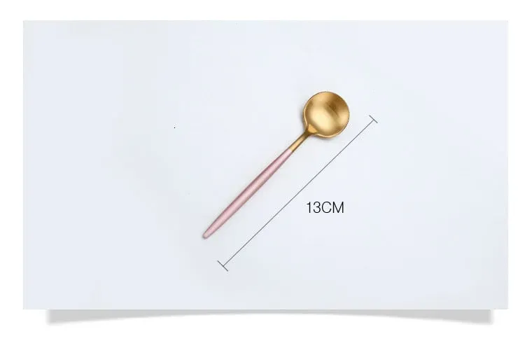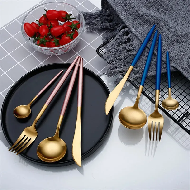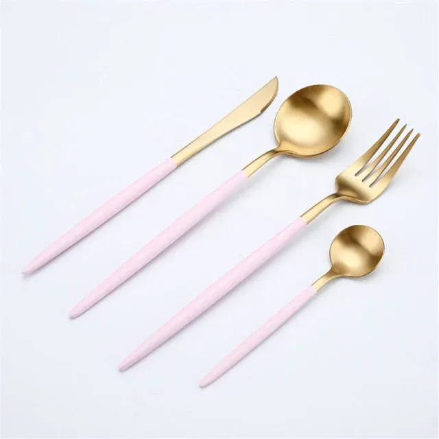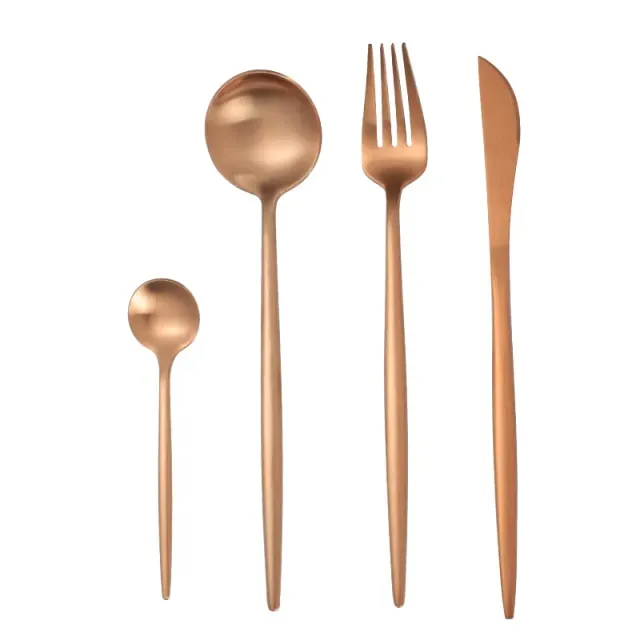 These stainless steel flatware set comes with 4pcs each: 1pc dessert spoon, 1pc dinner fork, 1pcs dinner spoons, and 1pc dinner knife
