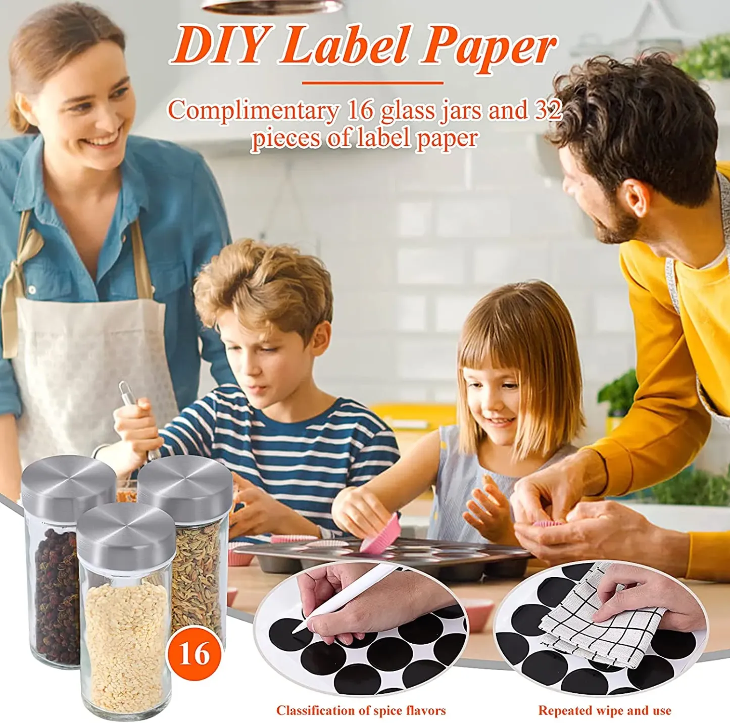 【16 Glass Jars】DOUBLE2C spice rack is equipped with 16 3oz refillable glass jars(3.5'x1.3') with metal over-caps, as well as with an inside plastic 'shaker top' that keeps the spices from getting into the cap. (Note: Spices are not included. The top of the lid with a blue protective film-peelable.)