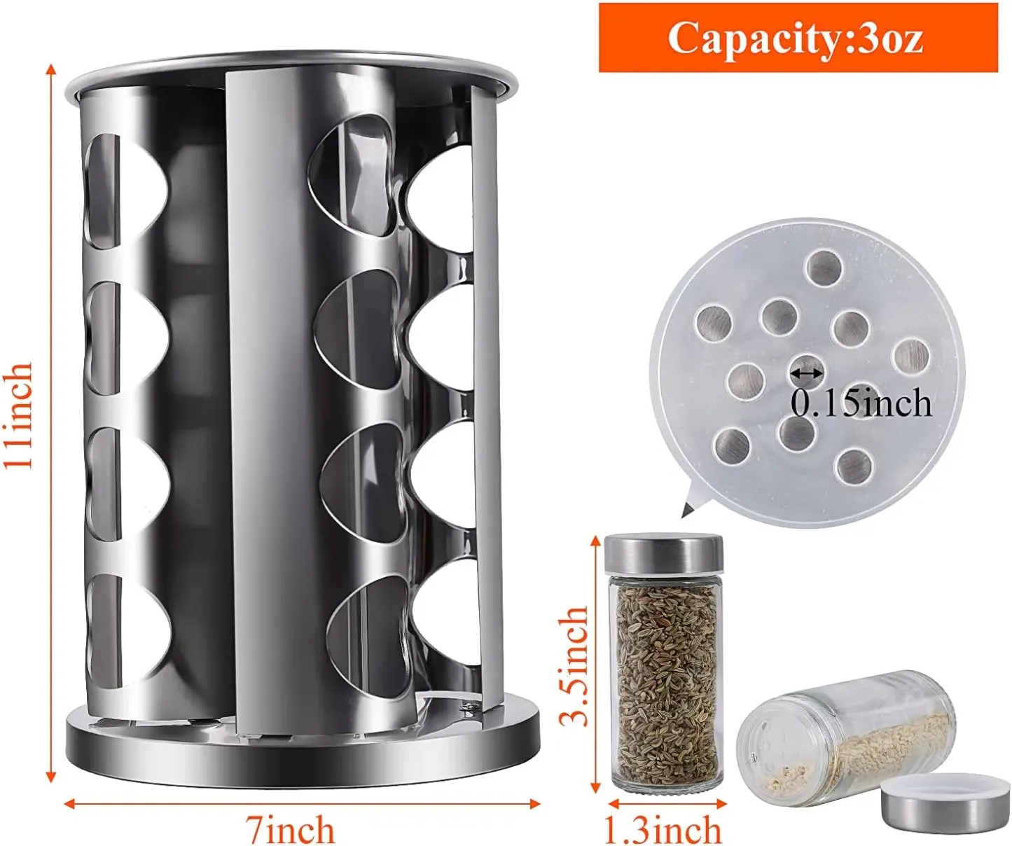 【Safe & Durable Material】Our rotating revolving spice rack is made of high quality stainless steel, strong and durable. The glass jar is made of lead-free glass, which is safe and secure to store the spices, and the transparent jar body is convenient for observing the spices.