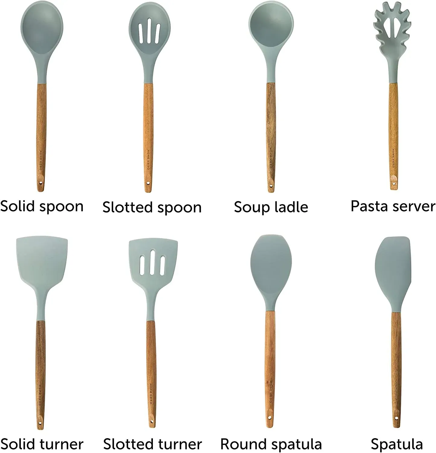 Why acacia? This is durable hardwood – important for the kitchen! – and can last up to 40 years with the proper care. The wooden handles have great heat insulation, protecting your hands from scalding. The silicone heads can withstand temperatures ranging from -22°F/-30°C to 392°F/200°C.